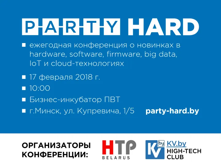 Организаторы конференции – белорусский IT-портал KV.by и Парк высоких технологий. Агентство ПраймПресс выступает информационным партнером конференции Party Hard 2018.