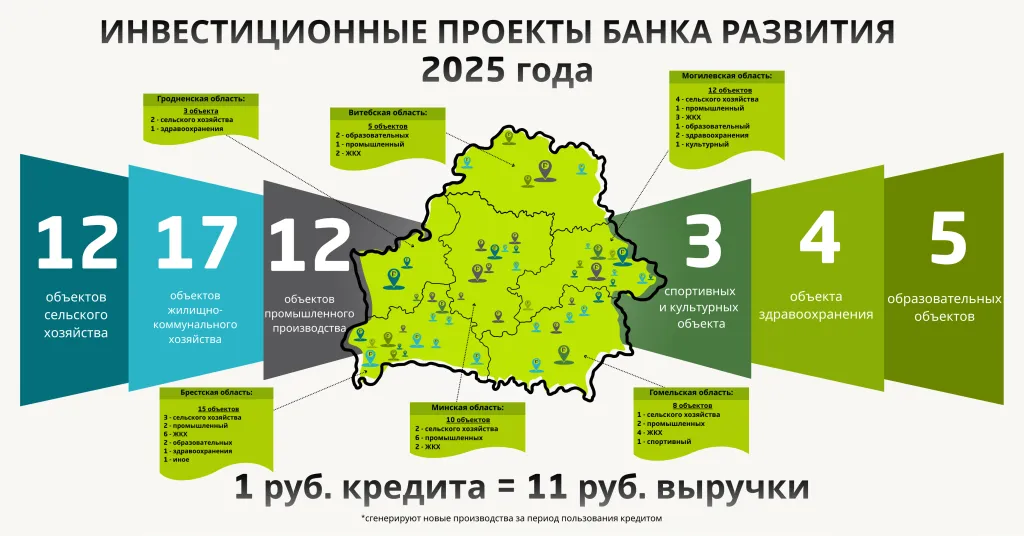 <p> <img width="380" alt="Банк развития профинансировал 53 новых проекта в 2025 году" src="/upload/resize_cache/webp/upload/medialibrary/090/bank_razv_new_kred.webp" height="260" title="Банк развития профинансировал 53 новых проекта в 2025 году" align="right">Экономика Беларуси по итогам 2025 г усилилась 53 новыми объектами, финансирование которых осуществлялось за счет ресурсов ОАО «Банк развития Республики Беларусь». Проекты были реализованы в сфере промышленности, сельского хозяйства, ЖКХ, здравоохранения, образования, спорта и культуры, <u> <!--noindex--><a rel="nofollow" target="_blank" href="https://brrb.by/about/press/news/effekt-banka-razvitiya-2025-regionalnyy-aktsent-polsotni-proektov-c-11-kratnym-rostom-vyruchki/">сообщает</a><!--/noindex--></u> пресс-служба банка. </p> <p> Как отмечается, только за период пользования кредитными ресурсами Банка развития 24 новых объекта сгенерируют с 1 бел руб заемных средств 11 бел руб выручки. </p> <p> «Кроме того, введено в эксплуатацию 29 объектов, направленных на создание комфортных условий и повышение уровня жизни белорусов. Это современные медицинские учреждения, школы и детские сады, спортивные и коммунальные объекты, культурно-исторические центры», — говорится в сообщении. </p> <p> В банке проинформировали, что самое большое количество проектов реализовано в Брестской и Могилевской областях: 15 и 12 соответственно. </p> <p> В Минской и Гомельской областях в прошлом году появилось 18 новых объектов, построенных с финансовым участием Банка развития: 10 – в Минской, 8 – в Гомельской. </p> <p> В Витебской и Гродненской областях появилось 8 объектов. </p> <p> ОАО «Банк развития Республики Беларусь» создано в 2011 г и в соответствии с указом президента №261 от 21 июня 2011 г финансирует государственные программы от своего имени и за свой счет на условиях срочности, платности и возвратности. Целью создания Банка развития было повышение эффективности исполнения проектов, включенных в госпрограммы, сокращение сроков их реализации и окупаемости затрат. Доля государства в уставном фонде банка составляет 96,224%. </p> <p> <a href="/upload/resize_cache/webp/images/1.webp" title="Банк развития профинансировал 53 новых проекта в 2025 году" target="_blank"><img width="770" alt="Банк развития профинансировал 53 новых проекта в 2025 году" src="/upload/resize_cache/webp/images/1.webp" height="403" title="Банк развития профинансировал 53 новых проекта в 2025 году" align="middle"></a><br> </p>