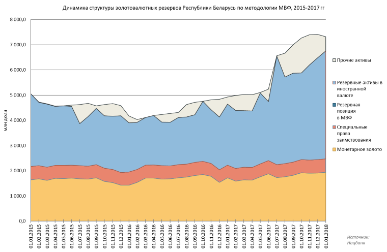 По данным на 1 января 2018 г в структуре ЗВР было 1,5 млрд заемных средств в виде долга по облигациям перед банками со сроками погашения до года и 4,8 млрд долл депозит Минфина в Нацбанке, сформированный главным образом за счет поступления ресурсов от кредиторов Беларуси. То есть, из 7,315 млрд долл до 6,3 млрд долл составляли заемные средства.