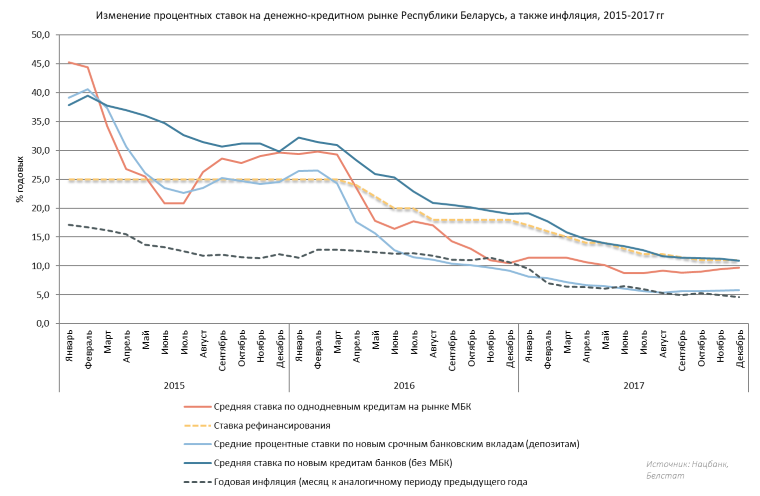 «Уровень ставок, который сформирован на кредитно-депозитном рынке, это минимальный уровень в истории Беларуси. Не стоит ожидать, что в текущем году продолжится такое же (как и в 2017 г – ред.) снижение ставок. Оно будет, я бы ориентировал, что оно будет минимальным», - сказал Мурин, добавив, что в случае, если ставка рефинансирования в 2018 г будет снижена на 1 п.п., то ставки по кредитам для реального сектора будут снижены в этих же пределах или меньших.