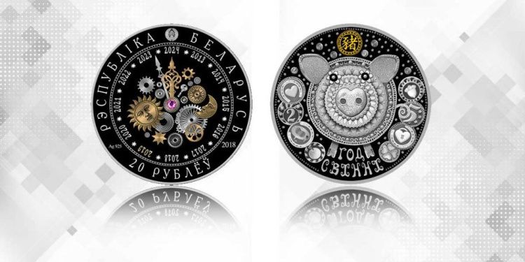 В обращение выпущена серебряная памятная монета «Год Свінні» серии «Кiтайскi каляндар» номиналом 20 рублей, пробой сплава 925, массой 33,63 г, диаметром 38,61 мм, тиражом 1000 штук.