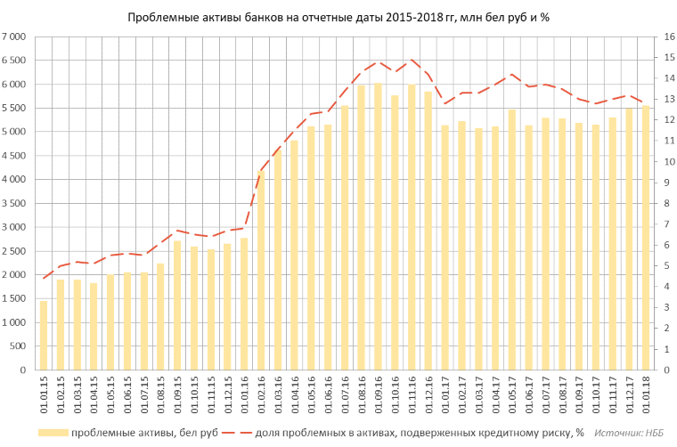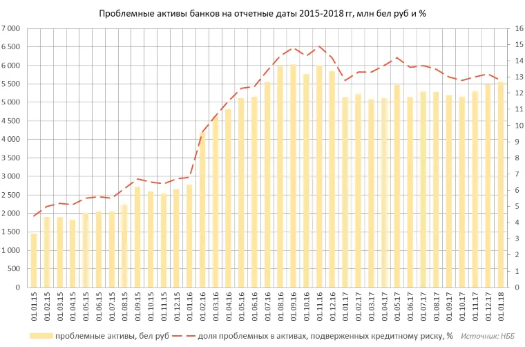 Проблемные активы белорусских банков сейчас находятся на уровне около 13% (см. диаграмму).