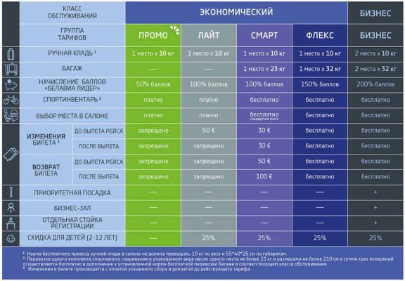 <p> МИНСК, 18 ноября – ПраймПресс. Авиакомпания «Белавиа» с 18 ноября 2019 г переходит на новую структуру тарифов, которая позволит пассажирам самостоятельно выбирать набор услуг для перелета. В рамках новой концепции также увеличивается вес ручной клади с 8 до 10 кг, сообщает пресс-служба авиакомпании. </p> <p> <img width="760" alt="Белавиа увеличивает вес ручной клади и вводит новую систему тарифов" src="/upload/medialibrary/723/belavia.jpg" height="400" title="Белавиа увеличивает вес ручной клади и вводит новую систему тарифов"><br> </p> <p> Как сообщается, в новой системе тарифов будут доступны безбагажные тарифы. Количество мест и стоимость авиабилетов в различных тарифных брендах будет варьироваться в зависимости от вместимости воздушного судна, количества пассажиров на рейсе и других факторов. Разница между стоимостью безбагажного перелета и минимальной стоимостью билета с багажом по маршруту «туда-обратно» будет составлять до 65 евро в зависимости от направления. «Так, например, минимальная стоимость билета «туда-обратно» без багажа в Калининград будет начинаться от 85 евро (ранее минимальная цена авиаперевозки с багажом начиналась и остается на данный момент от 115 евро), из Минска в Прагу стоимость перевозки «туда-обратно» без багажа будет начинаться от 166 евро (минимальная цена ранее с багажом – от 204 евро, сейчас – от 191 евро), из Минска в Киев – авиабилет «туда-обратно» без багажа - от 109 евро (минимальная цена ранее с багажом – 134 евро, сейчас – 139 евро)», — говорится в сообщении. </p> <p> Все тарифы авиакомпании разделены на пять групп: «Промо», «Лайт», «Смарт», «Флекс» и «Бизнес». </p> <p> В тарифных брендах «Промо» и «Лайт» будут предлагаться самые доступные по стоимости авиабилеты. Оба бренда дают возможность бесплатно перевезти только ручную кладь весом не более 10 кг. При необходимости покупки багажа стоимость провоза одного чемодана снижена с 50 до 25 евро для вышеуказанных брендов. </p> <p> В тарифы группы «Смарт» уже включен бесплатный провоз не только одного места ручной клади весом до 10 кг, но и зарегистрированного багажа весом до 23 кг. Тарифы «Смарт» также предполагают возможность бесплатного предварительного выбора отдельных категорий мест на борту самолета. </p> <p> Условия тарифа «Флекс» предполагают, кроме бесплатного провоза ручной клади, бесплатный провоз одного места багажа весом до 32 кг. Услуга предварительного выбора места в салоне, а также изменения даты вылета и возврата билета предоставляются бесплатно. </p> <p> «Бизнес» тариф включает в себя наибольшее количество услуг: бесплатный провоз двух мест ручной клади весом не более 10 кг каждое и двух мест зарегистрированного багажа весом до 32 кг каждое, бесплатный предварительный выбор места на борту и возможность изменения и возврата билета до и после вылета. Кроме того, авиакомпания предлагает пассажирам, путешествующим по тарифу «Бизнес», приоритетную посадку, обслуживание в бизнес-зале и отдельную стойку регистрации. </p> <p> В авиакомпании уточнили, что спортивное снаряжение перевозится без дополнительной оплаты согласно действующим правилам авиакомпании по тарифам групп «Смарт», «Флекс» и «Бизнес». </p> <p> По словам генерального директора авиакомпании Анатолия Гусарова, основная цель таких изменений – предоставить пассажирам возможность самостоятельно подобрать наиболее удобный вариант путешествия. «Мы 
