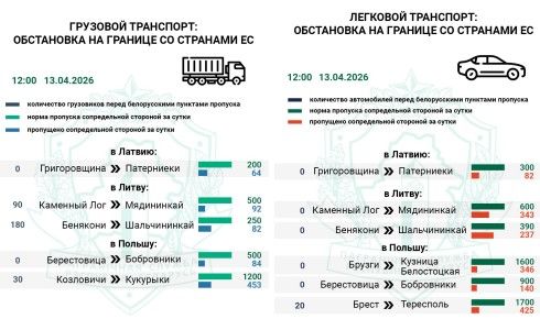 <p> Более 300 грузовых транспортных средств ожидают въезда в ЕС, <!--noindex--><a href="https://t.me/gpkgovby/8726" rel="nofollow" target="_blank">сообщает</a><!--/noindex--><!--noindex--><a rel="nofollow" target="_blank" href="https://t.me/gpkgovby/8726"></a><!--/noindex--> пресс-служба Государственного пограничного комитета Беларуси. </p> <p> Так, въезда в Литву перед пунктами пропуска Мядининкай (Каменный Лог) и Шальчининкай (Бенякони) ожидают 90 и 180 большегрузов соответственно. Сопредельная сторона за выходные дни оформила 25% грузовиков от нормы. </p> <p> Перед погранпереходом Кукурыки (Козловичи) на въезд в Польшу — 30 фур. Контролирующие службы данного пункта пропуска за выходные оформили 38% транспорта от нормы. </p> <p> Незначительное количество легковых авто фиксируется перед польским Тересполем (Брест) — в очереди находится 20 единиц транспорта. </p> <p> <img src="file:///C:/Users/User/OneDrive/Desktop/Снимок%20экрана%202026-04-13%20125839.jpg"><img src="/upload/medialibrary/2c0/content_img.jpeg" align="bottom"> </p>