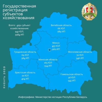 МИНСК, 7 февраля – ПраймПресс. За январь 2020 г в Республике Беларусь зарегистрировано 4,231 тыс субъектов хозяйствования (947 юридических лиц и 3,284 тыс индивидуальных предпринимателей). Информация об этом размещена на сайте Министерства юстиции.
