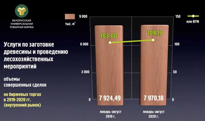 МИНСК, 2 октября – ПраймПресс. Сумма сделок по закупке услуг в сфере лесного хозяйства, реализованных в январе-августе 2020 г на торгах ОАО «Белорусская универсальная товарная биржа» (БУТБ), составила 109,2 млн бел руб. Это на 6% больше, чем за аналогичный период прошлого года. При этом наибольшим спросом пользовались услуги по заготовке древесины: на их долю пришлось свыше 74% от общего объема реализации, или 80,8 млн бел руб. В качестве поставщиков (продавцов) выступали преимущественно частные предприятия малого и среднего бизнеса, сообщает пресс-служба БУТБ.