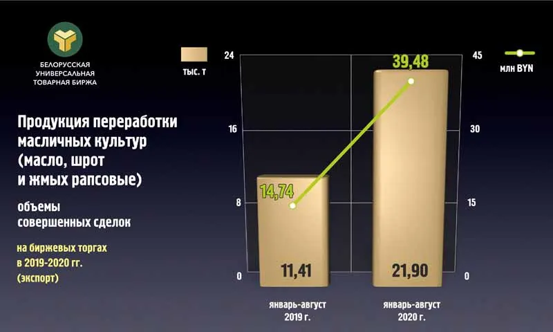 Всего по итогам восьми месяцев 2020 г на экспорт реализовано 22 тыс т рапсового масла на общую сумму 16,5 млн долл. Это в два раза больше прошлогоднего показателя в натуральном выражении и почти в три раза больше в стоимостном. На БУТБ отмечают, что интерес иностранных компаний к белорусской продукции обусловлен, с одной стороны, грамотной ценовой политикой отечественных экспортеров, а с другой – активной работой биржевых брокеров-нерезидентов.